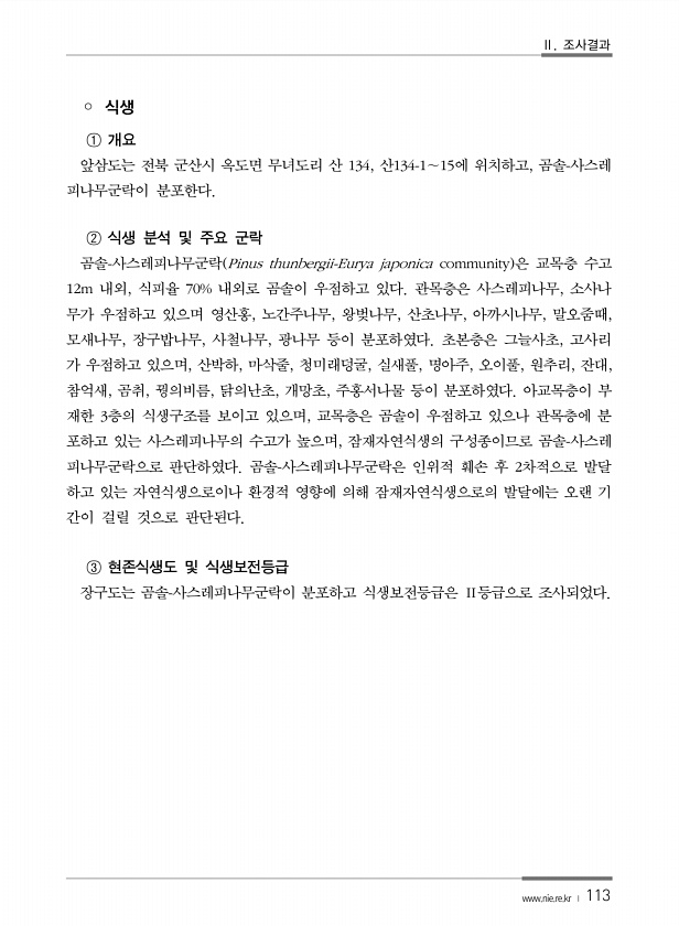 Ⅱ. 조사결과 www.nie.re.kr ? 113 ? 식생 ① 개요 앞삼도는 전북 군산시 옥도면 무녀도리 산 134, 산134-1∼15에 위치하고, 곰솔-사스레 피나무군락이 분포한다. ② 식생 분석 및 주요 군락 곰솔-사스레피나무군락 Pinus thunbergii-Eurya japonica community 은 교목층 수고 12m 내외, 식피율 70% 내외로 곰솔이 우점하고 있다. 관목층은 사스레피나무, 소사나 무가 우점하고 있으며 영산홍, 노간주나무, 왕벚나무, 산초나무, 아까시나무, 말오줌때, 모새나무, 장구밥나무, 사철나무, 광나무 등이 분포하였다. 초본층은 그늘사초, 고사리 가 우점하고 있으며, 산박하, 마삭줄, 청미래덩굴, 실새풀, 명아주, 오이풀, 원추리, 잔대, 참억새, 곰취, 꿩의비름, 닭의난...