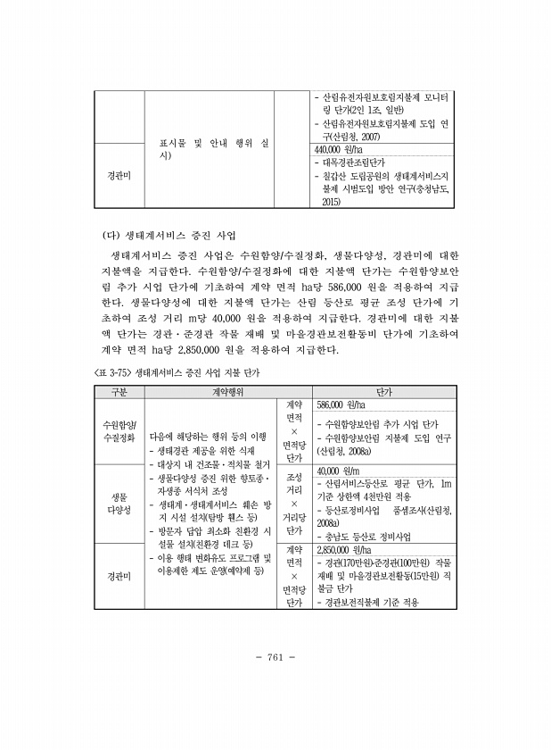 761 표시물 및 안내 행위 실 시 산림유전자원보호림지불제 모니터 링 단가 2인 1조, 일반 산림유전자원보호림지불제 도입 연 구 산림청, 2007 경관미 440,000 원/ha 대목경관조림단가 칠갑산 도립공원의 생태계서비스지 불제 시범도입 방안 연구 충청남도, 2015 다 생태계서비스 증진 사업 생태계서비스 증진 사업은 수원함양/수질정화, 생물다양성, 경관미에 대한 지불액을 지급한다. 수원함양/수질정화에 대한 지불액 단가는 수원함양보안 림 추가 시업 단가에 기초하여 계약 면적 ha당 586,000 원을 적용하여 지급 한다. 생물다양성에 대한 지불액 단가는 산림 등산로 평균 조성 단가에 기 초하여 조성 거리 m당 40,000 원을 적용하여 지급한다. 경관미에 대한 지불 액 단가는 경관·준경관 작물 재배 및 마...