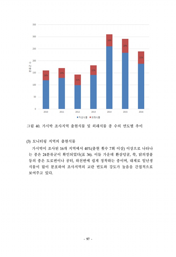 97 그림 40. 가시박 조사지역 출현식물 및 외래식물 종 수의 연도별 추이 3 모니터링 지역의 출현식물 가시박이 조사된 16개 지역에서 40% 출현 횟수 7회 이상 이상으로 나타나 는 종은 24분류군이 확인되었다 표 36 이들 가운데 환삼덩굴, 쑥, 닭의장풀 등의 종은 도로변이나 공터, 하천변에 쉽게 정착하는 종이며, 대체로 일년생 식물이 많이 분포하여 조사지역의 교란 빈도와 강도가 높음을 간접적으로 보여주고있다.