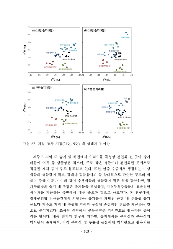 103 그림 62. 계절 조사 지점 21번, 9번 내 생태계 먹이망 제주도 지역 내 습지 및 하천에서 수리수문 특성상 건천화 된 곳이 많기 때문에 어류 등 생물상은 적으며, 주로 작은 생물이나 건천화된 곳에서도 적응된 개체 등이 주로 분포하고 있다. 또한 연중 수중에서 생활하는 수생 식물의 생물량이 적고, 갈대나 털물참새피 등 상대적으로 단순한 구조의 식 물이 주를 이룬다. 이와 같이 수생식물의 생물량이 적은 점을 감안하면, 점 개구리밥의 습지 내 우점은 유기물을 포섭하고, 미소무척추동물의 효율적인 서식처를 제공하는 측면에서 매우 중요한 것으로 사료된다. 본 연구에서, 점개구리밥 점유공간에서 기원하는 유기물은 개방된 공간 내 부유성 유기 물보다 제주도 지역 내 수생태 먹이망 구성에 중점적인 경로를 제공하는 ...