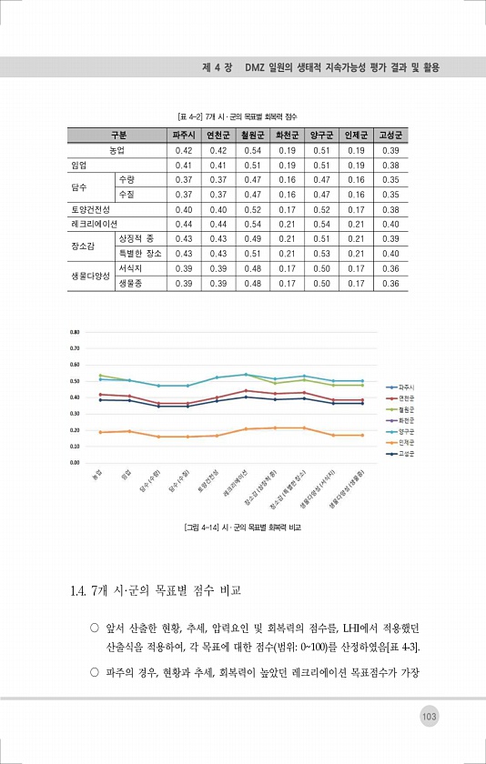 103 제 4 장 DMZ 일원의 생태적 지속가능성 평가 결과 및 활용 1.4. 7개 시·군의 목표별 점수 비교 ○ 앞서 산출한 현황, 추세, 압력요인 및 회복력의 점수를, LHI에서 적용했던 산출식을 적용하여, 각 목표에 대한 점수 범위0100 를 산정하였음[표 4-3]. ○ 파주의 경우, 현황과 추세, 회복력이 높았던 레크리에이션 목표점수가 가장 구분 파주시 연천군 철원군 화천군 양구군 인제군 고성군 농업 0.42 0.42 0.54 0.19 0.51 0.19 0.39 임업 0.41 0.41 0.51 0.19 0.51 0.19 0.38 담수 수량 0.37 0.37 0.47 0.16 0.47 0.16 0.35 수질 0.37 0.37 0.47 0.16 0.47 0.16 0.35 토양건전성 0.40 0.40 0....
