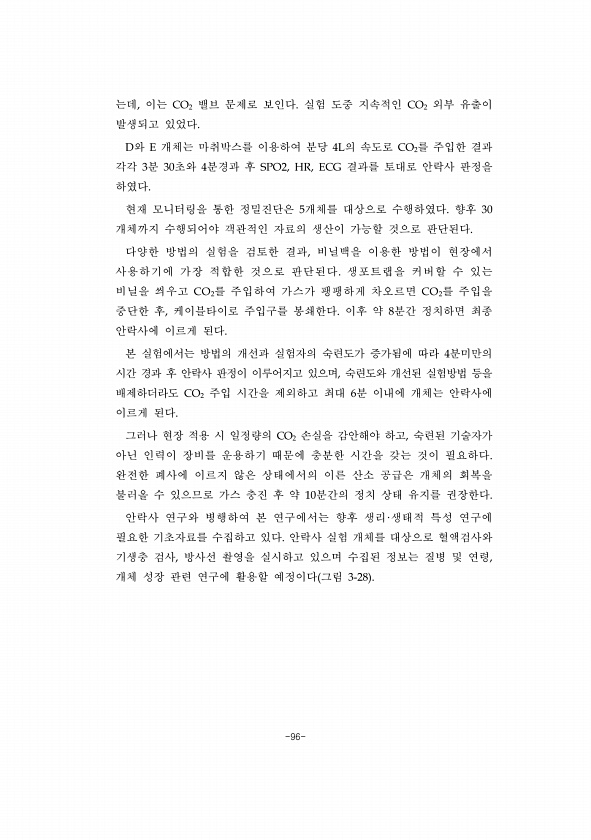 -96- 는데, 이는 CO2 밸브 문제로 보인다. 실험 도중 지속적인 CO2 외부 유출이 발생되고 있었다. D와 E 개체는 마취박스를 이용하여 분당 4L의 속도로 CO2를 주입한 결과 각각 3분 30초와 4분경과 후 SPO2, HR, ECG 결과를 토대로 안락사 판정을 하였다. 현재 모니터링을 통한 정밀진단은 5개체를 대상으로 수행하였다. 향후 30 개체까지 수행되어야 객관적인 자료의 생산이 가능할 것으로 판단된다. 다양한 방법의 실험을 검토한 결과, 비닐백을 이용한 방법이 현장에서 사용하기에 가장 적합한 것으로 판단된다. 생포트랩을 커버할 수 있는 비닐을 씌우고 CO2를 주입하여 가스가 팽팽하게 차오르면 CO2를 주입을 중단한 후, 케이블타이로 주입구를 봉쇄한다. 이후 약 8분간 정치하면 최종 안락사에 이...