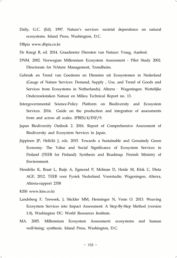 103 Daily, G.C. Ed 1997. Natures servicessocietal dependence on natural ecosystems. Island Press, Washington, D.C. DBpia www.dbpia.co.kr De Knegt B, ed. 2014. Graadmeter Diensten van NatuurVraag, Aanbod. DNM. 2002. Norwegian Millennium Ecosystem Assessment Pilot Study 2002. Directorate for NAture Management, Trondheim. Gebruik en Trend van Goederen en Diensten uit Ecosystemen in Nederland Gauge of...