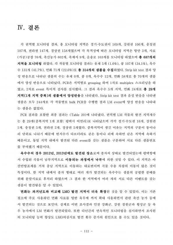 112 Ⅳ. 결론 각 권역별 모니터링 결과, 총 모니터링 지역은 경기·수도권이 169개, 강원권 106개, 충청권 107개, 전라권 147개, 경상권 158개였으며 각 목적성에 따른 모니터링 지역은 항만 3개, 사료 가공 공장 76개, 축산농가 602개, 축제지 9개, 운송로 103개를 모니터링 하였으며 총 687개의 지역을 모니터링 하였다. 각 작물별 모니터링 결과는 유채 5개 1.6% , 콩 107개 34.1% , 옥수 수 131개 41.7% , 면화 71개 22.6% 로 총 314개의 샘플을 수집하였다. Strip kit test 결과 양 성 반응으로 나타난 샘플의 수는 유채 0개, 콩 0개, 옥수수 12개, 면화 58개로 총 70개의 샘플 에서 양성 반응으로 나타났다. PCR은 지역별로 groupin...