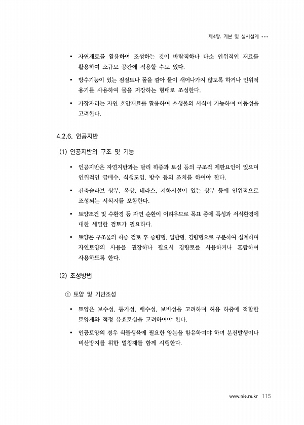 www.nie.re.kr 115 제4장. 기본 및 실시설계 자연재료를 활용하여 조성하는 것이 바람직하나 다소 인위적인 재료를 활용하여 소규모 공간에 적용할 수도 있다. 방수기능이 있는 점질토나 돌을 깔아 물이 새어나가지 않도록 하거나 인위적 용기를 사용하여 물을 저장하는 형태로 조성한다. 가장자리는 자연 호안재료를 활용하여 소생물의 서식이 가능하며 이동성을 고려한다. 4.2.6. 인공지반 1 인공지반의 구조 및 기능 인공지반은 자연지반과는 달리 하중과 토심 등의 구조적 제한요인이 있으며 인위적인 급배수, 식생도입, 방수 등의 조치를 하여야 한다. 건축슬라브 상부, 옥상, 테라스, 지하시설이 있는 상부 등에 인위적으로 조성되는 서식지를 포함한다. 토양조건 및 수환경 등 자연 순환이 어려우므로 목표 종에 특성과...