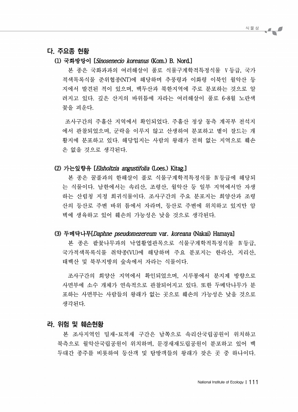 식 물 상 National Institute of EcologyⅠ111 다. 주요종 현황 1 국화방망이 [Sinosenecio koreanus Kom. B. Nord.] 본 종은 국화과과의 여러해살이 풀로 식물구계학적특정식물 Ⅴ등급, 국가 적색목록식물 준위협종 NT 에 해당하며 추풍령과 이화령 이북인 월악산 등 지에서 발견된 적이 있으며, 백두산과 북한지역에 주로 분포하는 것으로 알 려지고 있다. 깊은 산지의 바위틈에 자라는 여러해살이 풀로 68월 노란색 꽃을 피운다. 조사구간의 주흘산 지역에서 확인되었다. 주흘산 정상 동측 계곡부 전석지 에서 관찰되었으며, 군락을 이루지 않고 산생하여 분포하고 볕이 잘드는 개 활지에 분포하고 있다. 해당입지는 사람의 왕래가 전혀 없는 지역으로 훼손 은 없을 것으로 생각된다...