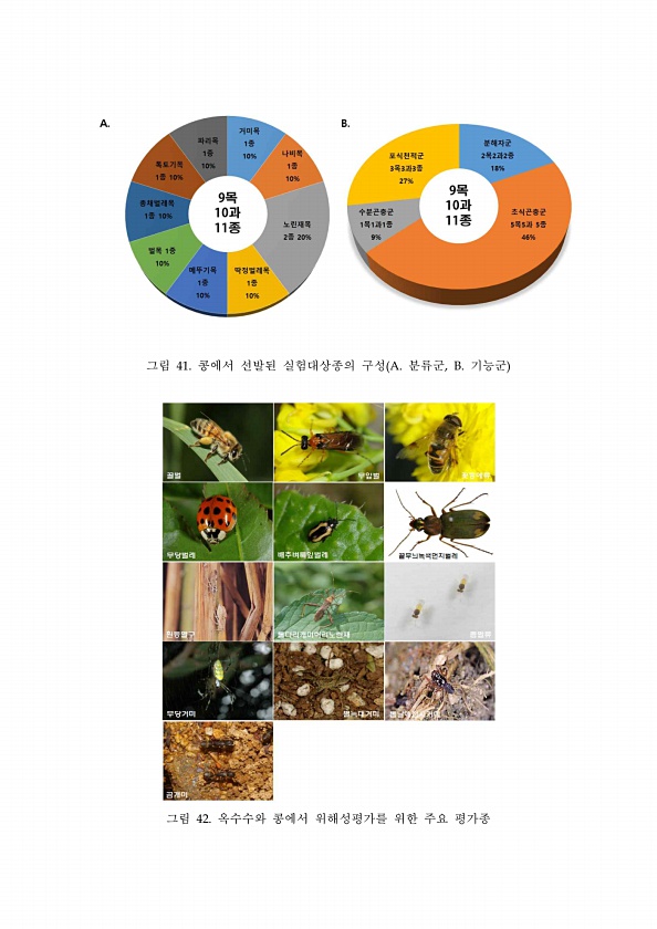 그림 41. 콩에서 선발된 실험대상종의 구성 A. 분류군, B. 기능군 그림 42. 옥수수와 콩에서 위해성평가를 위한 주요평가종