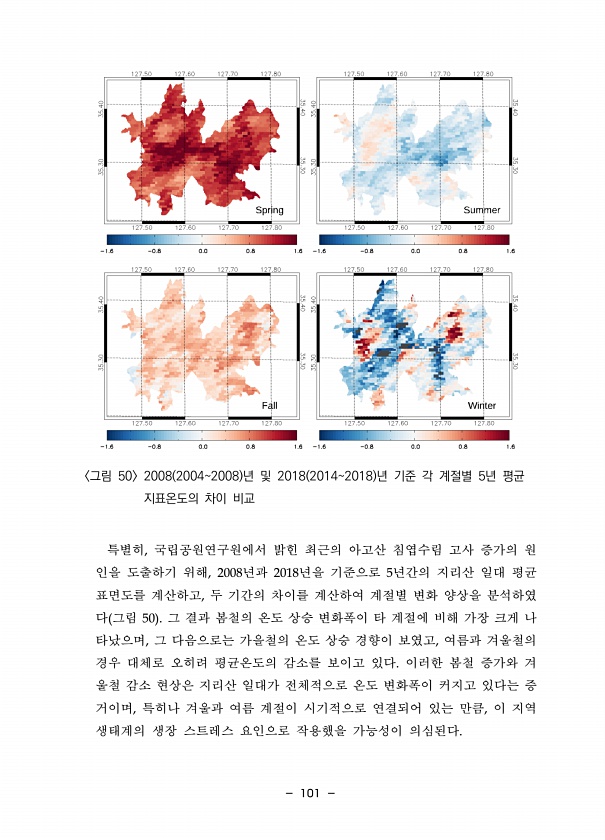 101 그림 50 2008 20042008 년 및 2018 20142018 년 기준 각 계절별 5년 평균 지표온도의 차이 비교 특별히, 국립공원연구원에서 밝힌 최근의 아고산 침엽수림 고사 증가의 원 인을 도출하기 위해, 2008년과 2018년을 기준으로 5년간의 지리산 일대 평균 표면도를 계산하고, 두 기간의 차이를 계산하여 계절별 변화 양상을 분석하였 다 그림 50 그 결과 봄철의 온도 상승 변화폭이 타 계절에 비해 가장 크게 나 타났으며, 그 다음으로는 가을철의 온도 상승 경향이 보였고, 여름과 겨울철의 경우 대체로 오히려 평균온도의 감소를 보이고 있다. 이러한 봄철 증가와 겨 울철 감소 현상은 지리산 일대가 전체적으로 온도 변화폭이 커지고 있다는 증 거이며, 특히나 겨울과 여름 계절이 시기적으로 연결되...
