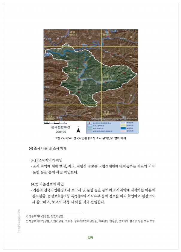 124 제5차 전국자연환경조사 지침 그림 25. 제5차?전국자연환경조사?조사?유역단위?범위?예시. 4 조사?내용?및?조사?체계 ?.? 조사지역의?확인 조사?지역에?대한?행정, 지리, 지형적?정보를?국립생태원에서?제공하는?자료와?기타 문헌?등을?통해?사전?확인한다. ?.? 기존정보의?확인 기존의?전국자연환경조사?보고서?및?문헌?등을?통하여?조사지역에?서식하는?어류의 분포현황, 법정보호종? 등?특정종? 의?서식유무?등의?정보를?미리?확인하여?현장조사 시?참고하며, 보고서?작성?시?이를?적극?반영한다. ? 멸종위기야생생물, 천연기념물 ? 멸종위기야생생물, 천연기념물, 고유종, 생태계교란야생동물, 기후변화?민감종,분포지역?협소종?등을?모두?포함