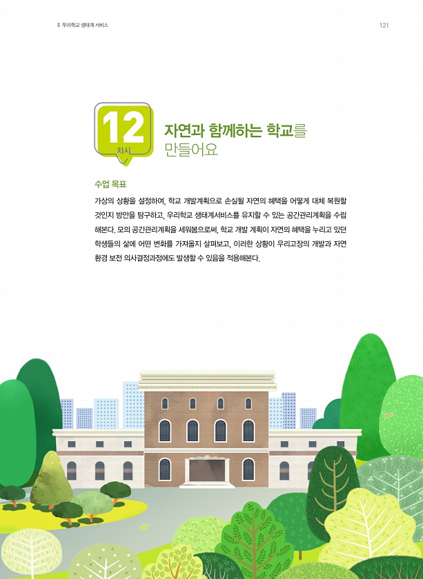 차시 12 수업 목표 가상의 상황을 설정하여, 학교 개발계획으로 손실될 자연의 혜택을 어떻게 대체 복원할 것인지 방안을 탐구하고, 우리학교 생태계서비스를 유지할 수 있는 공간관리계획을 수립 해본다. 모의 공간관리계획을 세워봄으로써, 학교 개발 계획이 자연의 혜택을 누리고 있던 학생들의 삶에 어떤 변화를 가져올지 살펴보고, 이러한 상황이 우리고장의 개발과 자연 환경 보전 의사결정과정에도 발생할 수 있음을 적용해본다. 자연과 함께하는 학교를 만들어요 Ⅱ 우리학교 생태계 서비스121