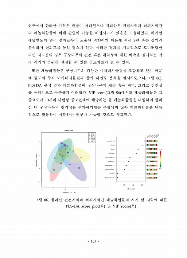 105 연구에서 한라산 지역은 판별이 어려웠으나 지리산은 건전지역과 쇠퇴지역간 의 페놀화합물에 의해 판별이 가능한 채집시기가 있음을 도출하였다. 하지만 해당연도의 연구 결과로부터 도출된 경향이기 때문에 최근 3년 혹은 장기간 분석하여 신뢰도를 높일 필요가 있다. 이러한 결과를 지속적으로 모니터링한 다면 지리산의 경우 구상나무의 건전 혹은 취약성에 대한 예측을 실시하는 적 정 시기와 범위를 설정할 수 있는 참고자료가 될 수 있다. 또한 페놀화합물은 구상나무의 다양한 이차대사물질을 포함하고 있기 때문 에 별도의 주요 이차대사물질과 함께 다변량 분석을 실시하였으나 그림 86 , PLS-DA 분석 결과 페놀화합물이 구상나무의 계절 혹은 지역, 그리고 건전성 을 유의적으로 구분하기 어려웠다. VIP score 그림 ...
