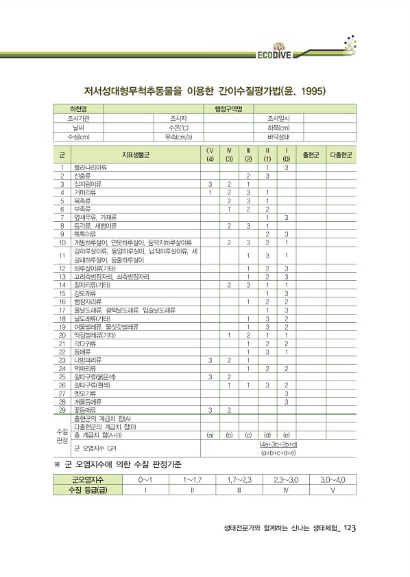 생태전문가와 함께하는 신나는 생태체험_ 123 저서성대형무척추동물을 이용한 간이수질평가법 윤. 1995 하천명 행정구역명 조사기관 조사자 조사일시 날씨 수온 ℃ 하폭 cm 수심 cm 유속 cm/s 바닥상태 군 지표생물군 Ⅴ 4 Ⅳ 3 Ⅲ 2 Ⅱ 1 Ⅰ 0 출현군 다출현군 1 플라나리아류 1 3 2 선충류 2 3 3 실지렁이류 3 2 1 4 거머리류 1 2 3 1 5 복족류 2 3 1 6 부족류 1 2 2 7 옆새우류, 가재류 1 3 8 등각류, 새뱅이류 2 3 1 9 톡톡이류 2 3 10 개똥하루살이, 연못하루살이, 등딱지하루살이류 2 3 2 1 11 강하루살이류, 동양하루살이, 납작하루살이류, 세 갈래하루살이, 등줄하루살이 1 3 1 12 하루살이류 기타 1 2 3 13 고려측범잠자리, 쇠측범잠자리 1 2...