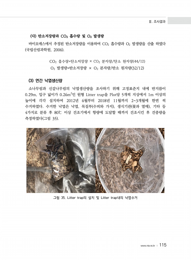 Ⅱ. 조사결과 www.nie.re.kr ? 115 다 탄소저장량과 CO2 흡수량 및 O2 발생량 바이오매스에서 추정된 탄소저장량을 이용하여 CO2 흡수량과 O2 발생량을 산출 하였다 국립산림과학원, 2006 CO2 흡수량=탄소저장량 × CO2 분자량/탄소 원자량 44/12 O2 발생량=탄소저장량 × O2 분자량/탄소 원자량 32/12 3 연간 낙엽생산량 소나무림과 신갈나무림의 낙엽생산량을 조사하기 위해 고정표준지 내에 반지름이 0.29m, 입구 넓이가 0.26m2인 원형 Litter trap을 Plot당 5개씩 지상에서 1m 이상의 높이에 각각 설치하여 2012년 6월부터 2018년 11월까지 23개월에 한번 씩 수거하였다. 수거한 낙엽은 낙엽, 목질부 수피와 가지 , 생식기관 꽃과 열매 , 기타 등 4가지...