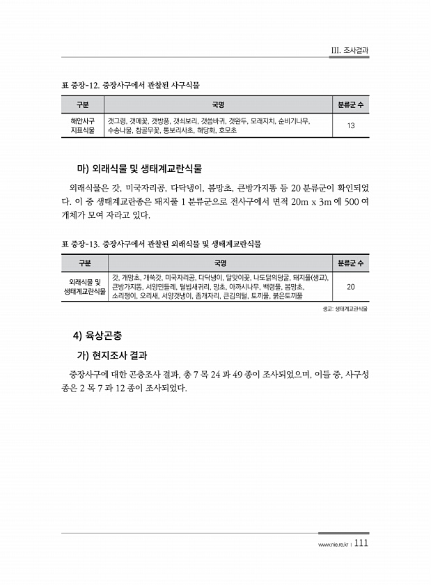 III. 조사결과 www.nie.re.kr ?111 구분 국명 분류군 수 해안사구 지표식물 갯그령, 갯메꽃, 갯방풍, 갯쇠보리, 갯씀바귀, 갯완두, 모래지치, 순비기나무, 수송나물, 참골무꽃, 통보리사초, 해당화, 호모초 13 표 중장-12. 중장사구에서 관찰된 사구식물 외래식물은 갓, 미국자리공, 다닥냉이, 봄망초, 큰방가지똥 등 20 분류군이 확인되었 다. 이 중 생태계교란종은 돼지풀 1 분류군으로 전사구에서 면적 20m x 3m 에 500 여 개체가 모여 자라고 있다. 구분 국명 분류군 수 외래식물 및 생태계교란식물 갓, 개망초, 개쑥갓, 미국자리공, 다닥냉이, 달맞이꽃, 나도닭의덩굴, 돼지풀 생교 , 큰방가지똥, 서양민들레, 털빕새귀리, 망초, 아까시나무, 백령풀, 봄망초, 소리쟁이, 오리새, 서양갯...