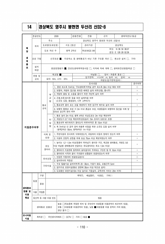 110 14 경상북도 영주시 봉현면 두산리 산32-8 해 당 생 태 통 로 준공연도 2009 겸용/전용 전용 근거 생태자연도1등급 위치 주소 경상북도 영주시 봉현면 두산리 산32-8 도로명 도로번호 시도 2호선 관리기관 경상북도 도로 차선 수 왕복 2차선 좌표 WGS 84 위도N 36 50 38.57 경도E 128 28 02.39 조성 기법 신규조성 ■, 수로박스 등 생태통로가 아닌 기존 구조물 개선 □, 펜스만 설치 □, 기타설치 배경 환경영향평가 ■, 한반도생태축복원사업 □, 지자체 자체 계획 □, 생태보전반환협력금 □ 유형 및 규격 육교형 ■ 터널형 □, 양서?파충류 통로 □ 길이10m, 너비37m 입구면적㎡ 너비 m, 높이 m , 길이m 개방도 입구면적/길이 지침준수여부 통로 규격 육 교 형 조사내용...