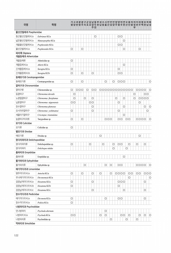 122 물삿갓벌레과 Psephenidae 둥근물삿갓벌레 KUa Eubrianax KUa ○ ○○ 넓은물삿갓벌레 KUa Mataeopsephus KUa ○ 개울물삿갓벌레 KUa Psephenoides KUa ○○ 물삿갓벌레 KUa Psephenoides KUa ○ ○ ○ ○ 파리목 Diptera 개울등에과 Athericidae 개울등에류 Athericidae sp. ○ 개울등에 KUa Atherix KUa ○ 긴개울등에 KUa Suragina KUa ○ ○ 긴개울등에 KUb Suragina KUb ○ ○ ○ ○○ 등에모기과 Ceratopogonidae 등에모기류 Ceratopogonidae sp. ○ ○ ○ ○ ○○○ ○ 깔따구과 Chironomidae 깔따구류 Chironomidae sp. ○ ○○○ ○ ○...
