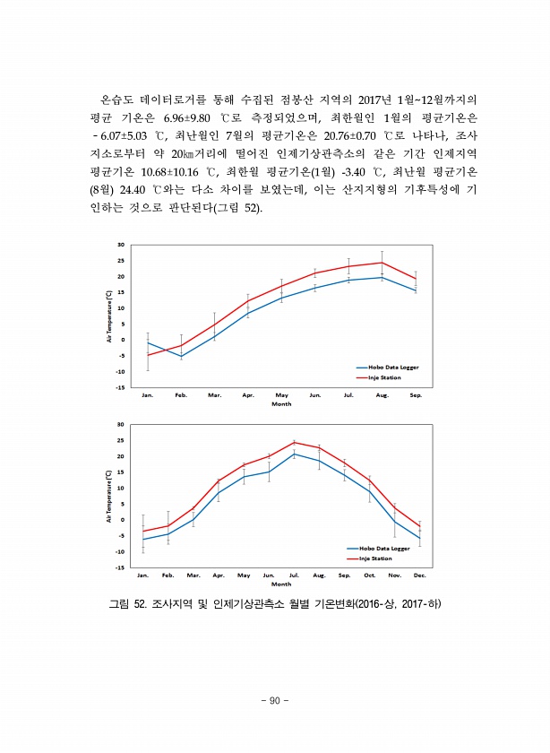 온습도 데이터로거를 통해 수집된 점봉산 지역의 2017년 1월12월까지의 평균 기온은 6.96±9.80 ℃로 측정되었으며, 최한월인 1월의 평균기온은 ?6.07±5.03 ℃, 최난월인 7월의 평균기온은 20.76±0.70 ℃로 나타나, 조사 지소로부터 약 20㎞거리에 떨어진 인제기상관측소의 같은 기간 인제지역 평균기온 10.68±10.16 ℃, 최한월 평균기온 1월 -3.40 ℃, 최난월 평균기온 8월 24.40 ℃와는 다소 차이를 보였는데, 이는 산지지형의 기후특성에 기 인하는 것으로 판단된다 그림 52 그림 52. 조사지역 및 인제기상관측소 월별 기온변화 2016-상, 2017-하 90