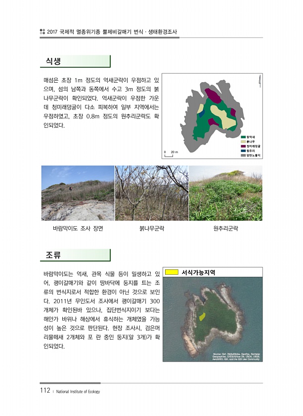 2017 국제적 멸종위기종 뿔제비갈매기 번식·생태환경조사 112 ? National Institute of Ecology 식생 매섬은 초장 1m 정도의 억새군락이 우점하고 있 으며, 섬의 남쪽과 동쪽에서 수고 3m 정도의 붉 나무군락이 확인되었다. 억새군락이 우점한 가운 데 청미래덩굴이 다소 피복하여 일부 지역에서는 우점하였고, 초장 0.8m 정도의 원추리군락도 확 인되었다. 바람막이도 조사 장면 붉나무군락 원추리군락 조류 바람막이도는 억새, 관목 식물 등이 밀생하고 있 어, 괭이갈매기와 같이 땅바닥에 둥지를 트는 조 류의 번식지로서 적합한 환경이 아닌 것으로 보인 다. 2011년 무인도서 조사에서 괭이갈매기 300 개체가 확인된바 있으나, 집단번식지이기 보다는 해안가 바위나 해상에서 휴식하는 개체였을 가능...