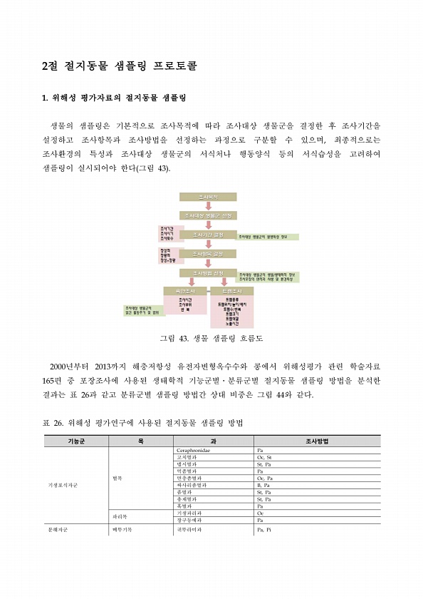 기능군 목 과 조사방법 기생포식자군 벌목 Ceraphronidae Pa 고치벌과 Oc, St 맵시벌과 St, Pa 먹좀벌과 Pa 면충좀벌과 Oc, Pa 싸사리좀벌과 B, Pa 좀벌과 St, Pa 총채벌과 St, Pa 혹벌과 Pa 파리목 기생파리과 Oc 장구등에과 Pa 분해자군 메뚜기목 귀뚜라미과 Pa, Pi 2절 절지동물 샘플링 프로토콜 1. 위해성 평가자료의 절지동물 샘플링 생물의 샘플링은 기본적으로 조사목적에 따라 조사대상 생물군을 결정한 후 조사기간을 설정하고 조사항목과 조사방법을 선정하는 과정으로 구분할 수 있으며, 최종적으로는 조사환경의 특성과 조사대상 생물군의 서식처나 행동양식 등의 서식습성을 고려하여 샘플링이 실시되어야 한다 그림 43 그림 43. 생물 샘플링 흐름도 2000년부터 2013까지 ...