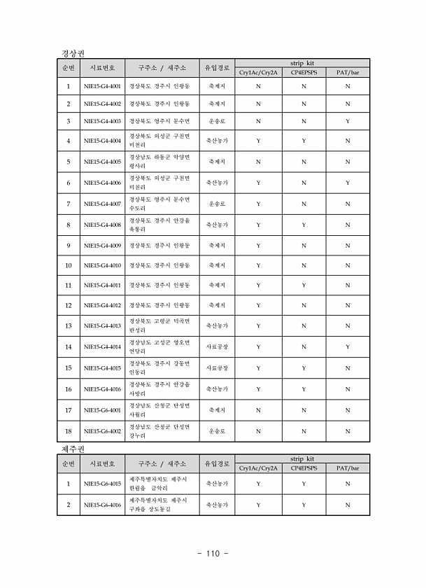 경상권 순번 시료번호 구주소 새주소 유입경로 strip kit Cry1Ac/Cry2A CP4EPSPS PAT/bar 1 NIE15-G4-4001 경상북도 경주시 인왕동 축제지 N N N 2 NIE15-G4-4002 경상북도 경주시 인왕동 축제지 N N N 3 NIE15-G4-4003 경상북도 영주시 문수면 운송로 N N Y 4 NIE15-G4-4004 경상북도 의성군 구천면 미천리 축산농가 Y Y N 5 NIE15-G4-4005 경상남도 하동군 악양면 평사리 축제지 N N N 6 NIE15-G4-4006 경상북도 의성군 구천면 미천리 축산농가 Y N Y 7 NIE15-G4-4007 경상북도 영주시 문수면 수도리 운송로 Y N N 8 NIE15-G4-4008 경상북도 경주시 안강읍 육통리 축산농가 Y Y N ...
