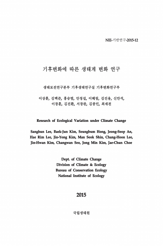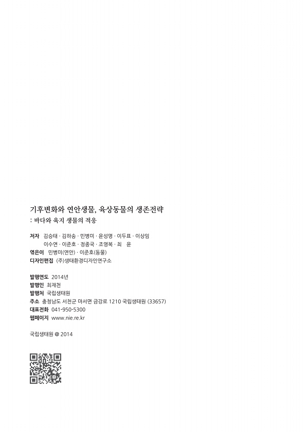 기후변화와 연안생물, 육상동물의 생존전략 바다와 육지 생물의 적응 저자 김승태 · 김하송 · 민병미 · 윤성명 · 이두표 · 이상임 이수연 · 이준호 · 정종국 · 조영복 · 최 윤 엮은이 민병미 연안 · 이준호 동물 디자인편집 주 생태환경디자인연구소 발행연도 2014년 발행인 최재천 발행처 국립생태원 주소 충청남도 서천군 마서면 금강로 1210 국립생태원 33657 대표전화 041-950-5300 웹페이지 www.nie.re.kr 국립생태원 @2014