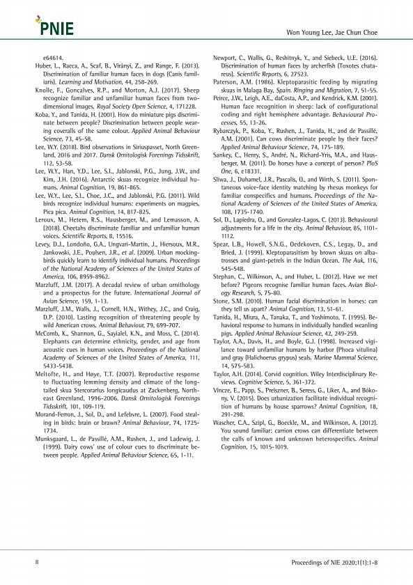 Won Young Lee, Jae Chun Choe 8 Proceedings of NIE 2020;1 1 1-8 e64614. Huber, L., Racca, A., Scaf, B., Vir?nyi, Z., and Range, F. 2013 Discrimination of familiar human faces in dogs Canis familiaris Learning and Motivation, 44, 258-269. Knolle, F., Goncalves, R.P., and Morton, A.J. 2017 Sheep recognize familiar and unfamiliar human faces from twodimensional images. Royal Society Open Science, 4, 1...