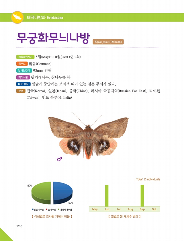 124 태극나방과 Erebidae 성충출현시기 5월 May 10월 Oct 연 2회 풍부도 많음 Common 날개편길이 93mm 안팎 먹이식물 왕가래나무, 참나무류 등 대표 형질 뒷날개 중앙에는 보라색 띠가 있는 검은 무늬가 있다. 분포 전국 Korea , 일본 Japan , 중국 China , 러시아 극동지역 Russian Far East , 타이완 Taiwan , 인도 북부 N. India 무궁화무늬나방 Thyas juno Dalman 【 식생별로 조사된 개체수 비율 】 50% 신갈나무림 소나무림 아까시나무림 50% 【 월별로 본 개체수 변화 】 Total2 individuals May Jun Jul Aug SepOct
