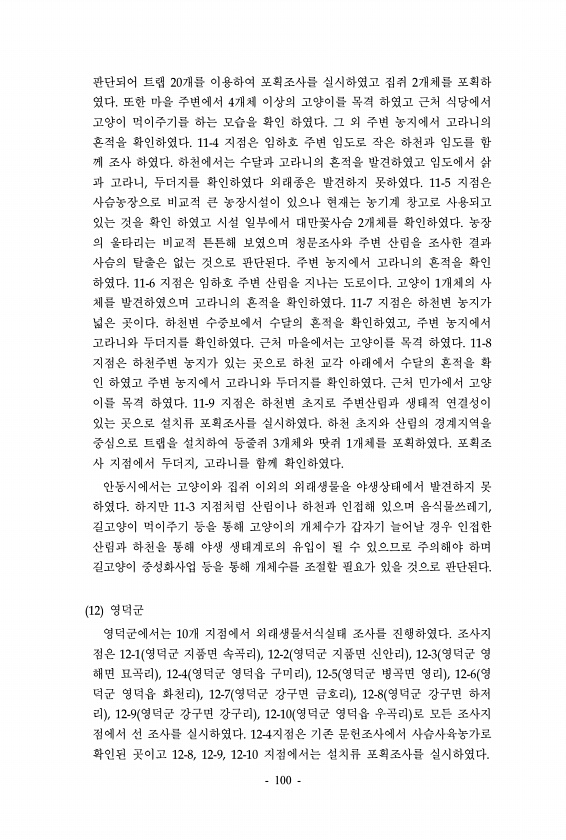 판단되어 트랩 20개를 이용하여 포획조사를 실시하였고 집쥐 2개체를 포획하 였다. 또한 마을 주변에서 4개체 이상의 고양이를 목격 하였고 근처 식당에서 고양이 먹이주기를 하는 모습을 확인 하였다. 그 외 주변 농지에서 고라니의 흔적을 확인하였다. 11-4 지점은 임하호 주변 임도로 작은 하천과 임도를 함 께 조사 하였다. 하천에서는 수달과 고라니의 흔적을 발견하였고 임도에서 삵 과 고라니, 두더지를 확인하였다 외래종은 발견하지 못하였다. 11-5 지점은 사슴농장으로 비교적 큰 농장시설이 있으나 현재는 농기계 창고로 사용되고 있는 것을 확인 하였고 시설 일부에서 대만꽃사슴 2개체를 확인하였다. 농장 의 울타리는 비교적 튼튼해 보였으며 청문조사와 주변 산림을 조사한 결과 사슴의 탈출은 없는 것으로 판단된다. 주...