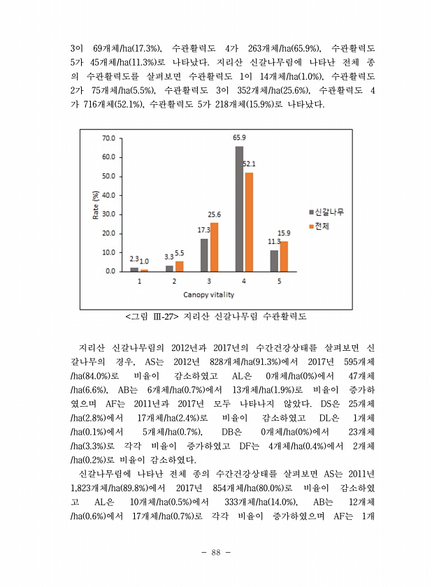 88 3이 69개체/ha 17.3% , 수관활력도 4가 263개체/ha 65.9% , 수관활력도 5가 45개체/ha 11.3% 로 나타났다. 지리산 신갈나무림에 나타난 전체 종 의 수관활력도를 살펴보면 수관활력도 1이 14개체/ha 1.0% , 수관활력도 2가 75개체/ha 5.5% , 수관활력도 3이 352개체/ha 25.6% , 수관활력도 4 가 716개체 52.1% , 수관활력도 5가 218개체 15.9% 로 나타났다. 그림 Ⅲ-27 지리산 신갈나무림 수관활력도 지리산 신갈나무림의 2012년과 2017년의 수간건강상태를 살펴보면 신 갈나무의 경우, AS는 2012년 828개체/ha 91.3% 에서 2017년 595개체 /ha 84.0% 로 비율이 감소하였고 AL은 0개체/ha 0% 에서 47개체 /ha...