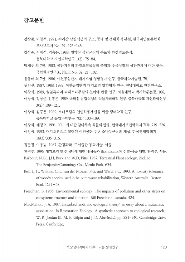 육상생태계에서 이루어지는 생태연구 123 참고문헌 강상준, 이창석. 1991. 속리산 삼림식생의 구조, 동태 및 생태학적 본원. 한국자연보존협회 조사보고서 No. 29123-148. 강상준, 이창석, 김홍은. 1988. 월악산 삼림군집의 분포와 환경경도분석. 충북대학교 자연과학연구 1 2 75-84. 박재주 외 7인. 1983. 공단지역의 환경오염물질의 축적과 수목성장의 상관관계에 대한 연구. 국립환경연구소, NEPI No. 82-21-102. 신응배 외 7인. 1986. 여천공업단지 대기오염 영향평가 연구. 한국과학기술원. 78. 위인선. 1987, 1988, 1989. 여천공업단지 대기오염 영향평가 연구. 전남대학교 환경연구소. 이창석. 1989. 솔잎혹파리 피해소나무림의 천이에 관한 연구. 서울대학교 ...