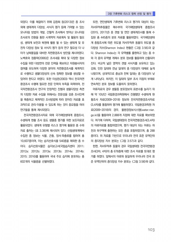 3장 기후변화 리스크 항목 선정 및 평가 103 되었다. 이를 해결하기 위해 김창회 등 2013 은 종 조사 외에 생태계의 다양성, 서식지 평가 등에 기여할 수 있는 모니터링 방법의 개발, 간헐적 조사에서 벗어난 모니터링 조사로의 전환을 통한 시계역적 자료획득 및 활용의 필요 성, 생태계 보전과 복원에 활용 될 수 있는 생태계 및 유 전자 다양성 정보 및 서식지 평가 등의 연구 필요성 더 나 아가 남북통일을 대비한 자연환경조사 방안을 제시하였다. 노백호와 정흥락 2006 은 조사내용 확대 및 다양한 정보 수집을 위한 다방면의 전문 인력을 확보하고 자원봉사자의 참여를 유도하여 다양한 분야의 자연환경조사를 체계적으 로 수행하고 생물다양성의 신속 정확한 정보를 생성할 수 있어야 한다고 하였다. 또한 이상돈 200...