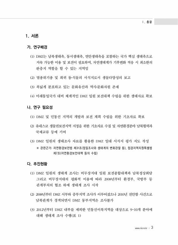 Ⅰ. 총괄 www.nie.re.kr ? 3 1. 서론 가. 연구배경 1 DMZ는 남북생태축, 동서생태축, 연안생태축을 포함하는 국가 핵심 생태축으로 지속 가능한 이용 및 보전이 필요하며, 자연생태계가 기후변화 적응 시 최소한의 완충지 역할을 할 수 있는 지역임 2 멸종위기종 및 희귀 동?식물의 서식지로서 생물다양성의 보고 3 폭넓게 분포하고 있는 문화유산과 역사?문화자원 존재 4 미래통일국가 대비 체계적인 DMZ 일원 보전대책 수립을 위한 생태자료 확보 나. 연구 필요성 1 DMZ 및 민통선 지역의 개발과 보전 계획 수립을 위한 기초자료 확보 2 유네스코 생물권보전지역 지정을 위한 기초자료 수집 및 자연환경분야 남북협력과 국제교류 등에 기여 3 DMZ 일원의 생태조사 자료를 활용한 DMZ 일대 서식지 평가 ...