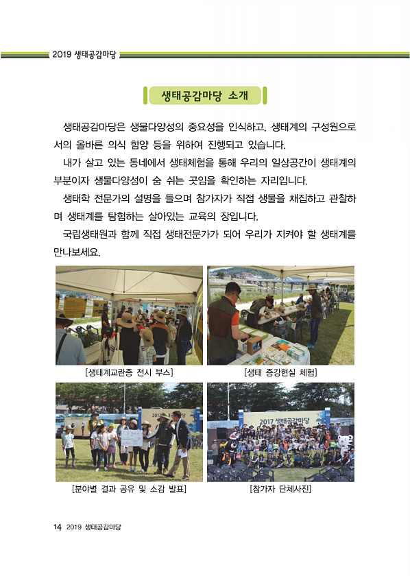 14 2019 생태공감마당 생태공감마당 소개 생태공감마당은 생물다양성의 중요성을 인식하고, 생태계의 구성원으로 서의 올바른 의식 함양 등을 위하여 진행되고 있습니다. 내가 살고 있는 동네에서 생태체험을 통해 우리의 일상공간이 생태계의 부분이자 생물다양성이 숨 쉬는 곳임을 확인하는 자리입니다. 생태학 전문가의 설명을 들으며 참가자가 직접 생물을 채집하고 관찰하 며 생태계를 탐험하는 살아있는 교육의 장입니다. 국립생태원과 함께 직접 생태전문가가 되어 우리가 지켜야 할 생태계를 만나보세요. [생태계교란종 전시 부스] [생태 증강현실 체험] [분야별 결과 공유 및 소감 발표] [참가자단체사진]