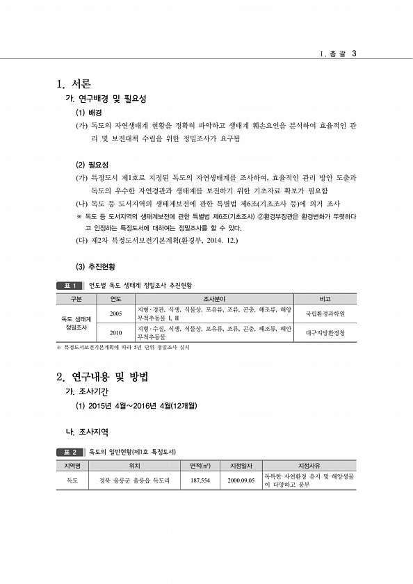 Ⅰ. 총 괄 3 1. 서론 가. 연구배경 및 필요성 1 배경 가 독도의 자연생태계 현황을 정확히 파악하고 생태계 훼손요인을 분석하여 효율적인 관 리 및 보전대책 수립을 위한 정밀조사가 요구됨 2 필요성 가 특정도서 제1호로 지정된 독도의 자연생태계를 조사하여, 효율적인 관리 방안 도출과 독도의 우수한 자연경관과 생태계를 보전하기 위한 기초자료 확보가 필요함 나 독도 등 도서지역의 생태계보전에 관한 특별법 제6조 기초조사 등 에 의거 조사 ※ 독도 등 도서지역의 생태계보전에 관한 특별법 제6조 기초조사 ②환경부장관은 환경변화가 뚜렷하다 고 인정하는 특정도서에 대하여는 정밀조사를 할 수 있다. 다 제2차 특정도서보전기본계획 환경부, 2014. 12. 3 추진현황 구분 연도 조사분야 비고 독도 생태계 정밀조사 2...