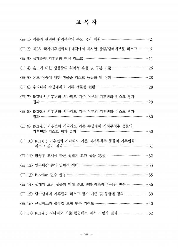 viii 표 목 차 표 1 적응과 관련한 환경분야의 주요 국가 계획 ···················································2 표 2 제2차 국가기후변화적응대책에서 제시한 산림/생태계부문 리스크 ···········6 표 3 생태분야 기후변화 핵심 리스크 ·····································································11 표 4 온도에 대한 생물종의 취약성 유형 및 구분 기준 ······································26 표 5 온도 상승에 대한 생물종 리스크 등급화 및 정의 ······································28 표 6 우리나라 수생태계의 어류 생물종...