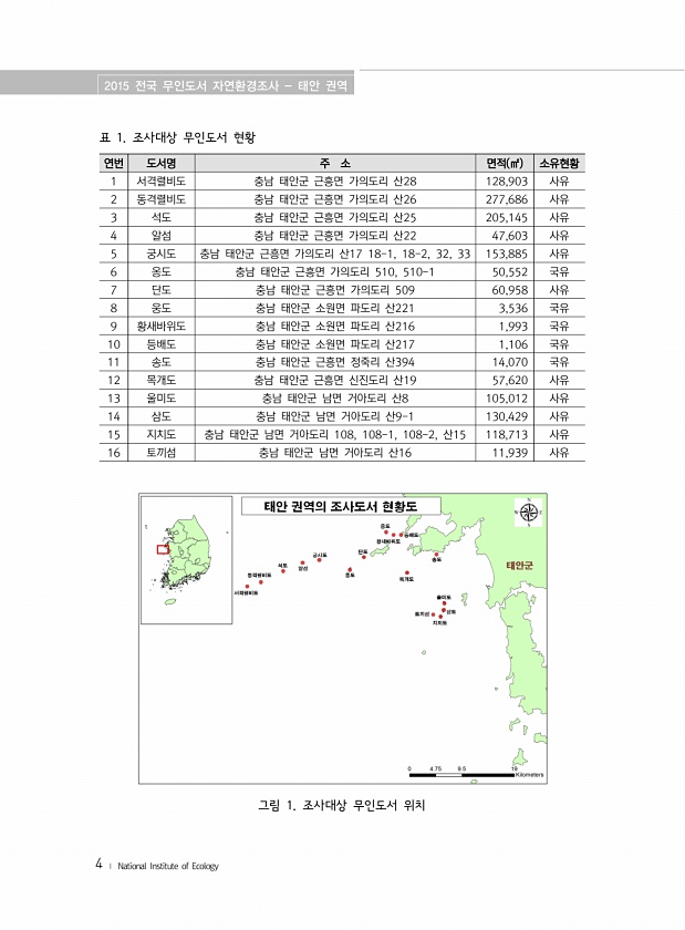2015 전국 무인도서 자연환경조사 태안 권역 4 ? National Institute of Ecology 연번 도서명 주 소 면적 ㎡ 소유현황 1 서격렬비도 충남 태안군 근흥면 가의도리 산28 128,903 사유 2 동격렬비도 충남 태안군 근흥면 가의도리 산26 277,686 사유 3 석도 충남 태안군 근흥면 가의도리 산25 205,145 사유 4 알섬 충남 태안군 근흥면 가의도리 산22 47,603 사유 5 궁시도 충남 태안군 근흥면 가의도리 산17 18-1, 18-2, 32, 33 153,885 사유 6 옹도 충남 태안군 근흥면 가의도리 510, 510-1 50,552 국유 7 단도 충남 태안군 근흥면 가의도리 509 60,958 사유 8 웅도 충남 태안군 소원면 파도리 산221 3,536 국유 9 황...
