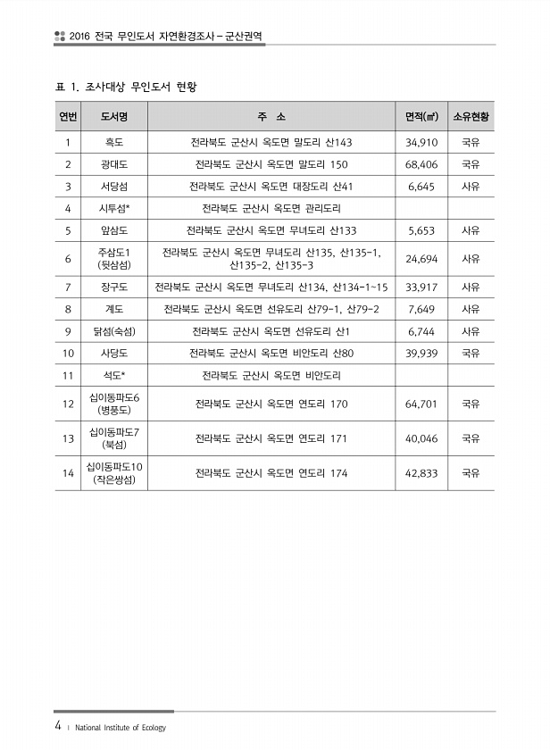 2016 전국 무인도서 자연환경조사 군산권역 4 ? National Institute of Ecology 연번 도서명 주 소 면적 ㎡ 소유현황 1 흑도 전라북도 군산시 옥도면 말도리 산143 34,910 국유 2 광대도 전라북도 군산시 옥도면 말도리 150 68,406 국유 3 서당섬 전라북도 군산시 옥도면 대장도리 산41 6,645 사유 4 시투섬* 전라북도 군산시 옥도면 관리도리 5 앞삼도 전라북도 군산시 옥도면 무녀도리 산133 5,653 사유 6 주삼도1 뒷삼섬 전라북도 군산시 옥도면 무녀도리 산135, 산135-1, 산135-2, 산135-3 24,694 사유 7 장구도 전라북도 군산시 옥도면 무녀도리 산134, 산134-115 33,917 사유 8 계도 전라북도 군산시 옥도면 선유도리 산79-1,...