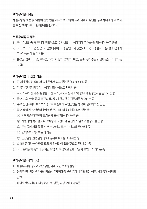 14 위해우려종이란? 생물다양성 보전 및 이용에 관한 법률 제22조의 규정에 따라 국내에 유입될 경우 생태계 등에 위해 를 미칠 우려가 있는 외래생물을 말한다. 위해우려종의 범위 1. 국내 미도입종 중 국내에 의도적으로 수입·도입 시 생태계에 위해를 줄 가능성이 높은 생물 2. 국내 의도적 도입종 중, 자연생태계에 아직 유입되지 않았거나, 국소적 분포 또는 향후 생태계 위해가능성이 높은 생물 ※ 분류군 범위 식물, 포유류, 조류, 파충류, 양서류, 어류, 곤충, 무척추동물 연체동물, 거미류 등 포함 위해우려종의 선정 기준 1. 전 세계적으로 널리 퍼져서 문제가 되고 있는 종 IUCN, GISD 등 2. 타국가 및 국제기구에서 생태계교란 생물로 지정된 종 3. 국내와 유사한 기후, 환경을 가진 국가 구북구 온...