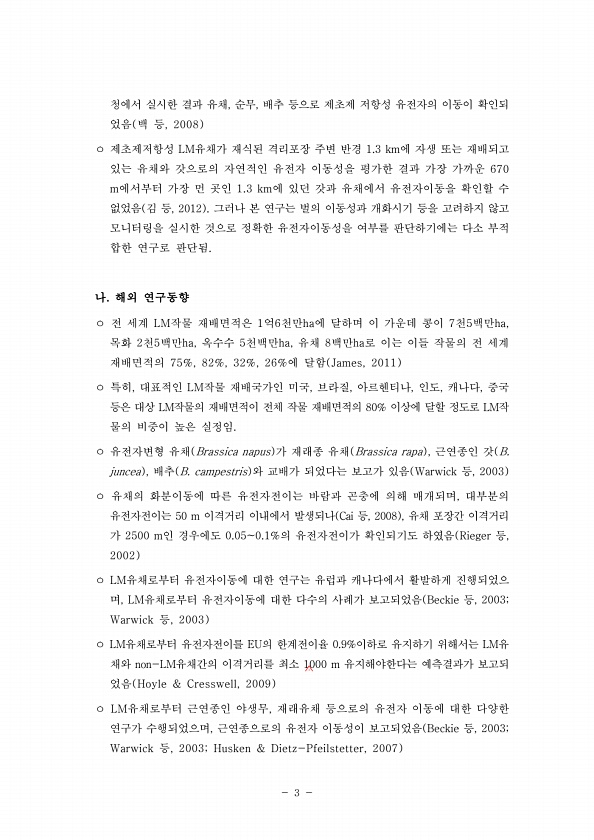 3 청에서 실시한 결과 유채, 순무, 배추 등으로 제초제 저항성 유전자의 이동이 확인되 었음 백 등, 2008 ㅇ 제초제저항성 LM유채가 재식된 격리포장 주변 반경 1.3 km에 자생 또는 재배되고 있는 유채와 갓으로의 자연적인 유전자 이동성을 평가한 결과 가장 가까운 670 m에서부터 가장 먼 곳인 1.3 km에 있던 갓과 유채에서 유전자이동을 확인할 수 없었음 김 등, 2012 그러나 본 연구는 벌의 이동성과 개화시기 등을 고려하지 않고 모니터링을 실시한 것으로 정확한 유전자이동성을 여부를 판단하기에는 다소 부적 합한 연구로 판단됨. 나. 해외 연구동향 ㅇ 전 세계 LM작물 재배면적은 1억6천만ha에 달하며 이 가운데 콩이 7천5백만ha, 목화 2천5백만ha, 옥수수 5천백만ha, 유채 8백만ha로 이는...