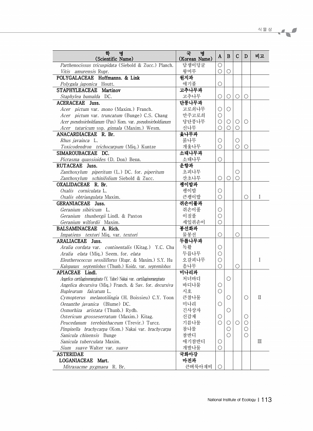 식 물 상 National Institute of EcologyⅠ113 학 명 Scientific Name 국 명 Korean Name A B C D 비고 Parthenocissus tricuspidata Siebold & Zucc. Planch. 담쟁이덩굴 ○ Vitis amurensis Rupr. 왕머루 ○ ○ POLYGALACEAE Hoffmanns. & Link 원지과 Polygala japonica Houtt. 애기풀 ○ STAPHYLEACEAE Martinov 고추나무과 Staphylea bumalda DC. 고추나무 ○ ○ ○ ○ ACERACEAE Juss. 단풍나무과 Acer pictum var. mono Maxim. Franch. 고로쇠나무 ○ ○ Acer pictum var. truncat...