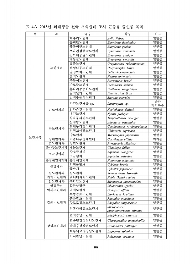 99 목 과 국명 학명 비고 노린재목 노린재과 메추리노린재 Aelia fieberi 일반종 홍비단노린재 Eurydema dominulus 일반종 북쪽비단노린재 Eurydema gebleri 일반종 보라흰점둥글노린재 Eysarcoris annamita 일반종 점박이둥글노린재 Eysarcoris guttiger 일반종 배둥글노린재 Eysarcoris ventralis 일반종 홍줄노린재 Graphosoma rubrolineatum 일반종 썩덩나무노린재 Halyomorpha halys 일반종 열점박이노린재 Lelia decempunctata 일반종 풀색노린재 Nezara antennata 일반종 주둥이노린재 Picromerus lewisi 일반종 가로줄노린재 Piezodorus hybneri 일반종 홍다리주둥이노린...