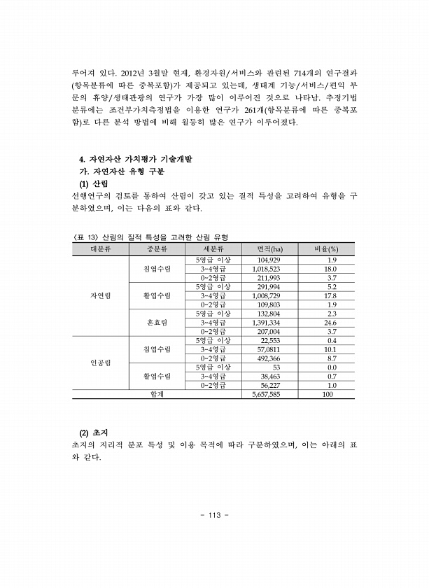 113 루어져 있다 년 월말 현재 환경자원 서비스와 관련된 개의 연구결과 항목분류에 따른 중복포함 가 제공되고 있는데 생태계 기능 서비스 편익 부 문의 휴양 생태관광의 연구가 가장 많이 이루어진 것으로 나타남 추정기법 분류에는 조건부가치측정법을 이용한 연구가 개 항목분류에 따른 중복포 함 로 다른 분석 방법에 비해 월등히 많은 연구가 이루어졌다 자연자산 가치평가 기술개발 가 자연자산 유형 구분 산림 선행연구의 검토를 통하여 산림이 갖고 있는 질적 특성을 고려하여 유형을 구 분하였으며 이는 다음의 표와 같다 대분류 중분류 세분류 면적 비율 자연림 침엽수림 영급 이상 영급 영급 활엽수림 영급 이상 영급 영급 혼효림 영급 이상 영급 영급 인공림 침엽수림 영급 이상 영급 영급 활엽수림 영급 이상 영급 영급 합계 표...