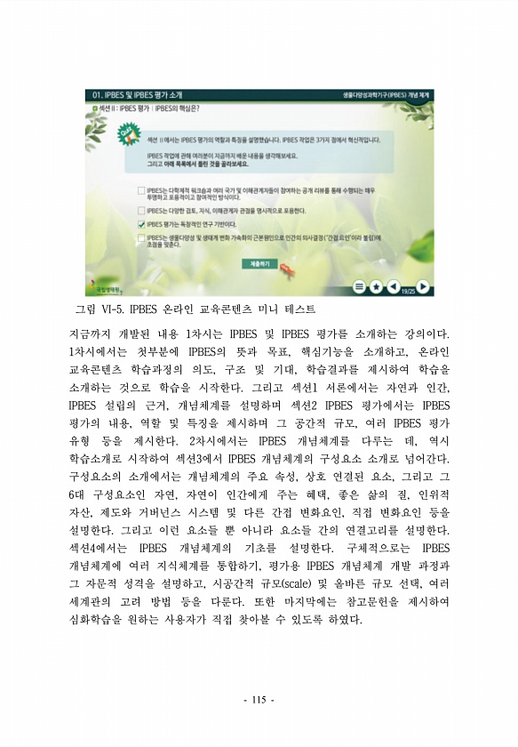 그림 VI-5. IPBES 온라인 교육콘텐츠 미니 테스트 지금까지 개발된 내용 1차시는 IPBES 및 IPBES 평가를 소개하는 강의이다. 1차시에서는 첫부분에 IPBES의 뜻과 목표, 핵심기능을 소개하고, 온라인 교육콘텐츠 학습과정의 의도, 구조 및 기대, 학습결과를 제시하여 학습을 소개하는 것으로 학습을 시작한다. 그리고 섹션1 서론에서는 자연과 인간, IPBES 설립의 근거, 개념체계를 설명하며 섹션2 IPBES 평가에서는 IPBES 평가의 내용, 역할 및 특징을 제시하며 그 공간적 규모, 여러 IPBES 평가 유형 등을 제시한다. 2차시에서는 IPBES 개념체계를 다루는 데, 역시 학습소개로 시작하여 섹션3에서 IPBES 개념체계의 구성요소 소개로 넘어간다. 구성요소의 소개에서는 개념체계의 주요 속성...