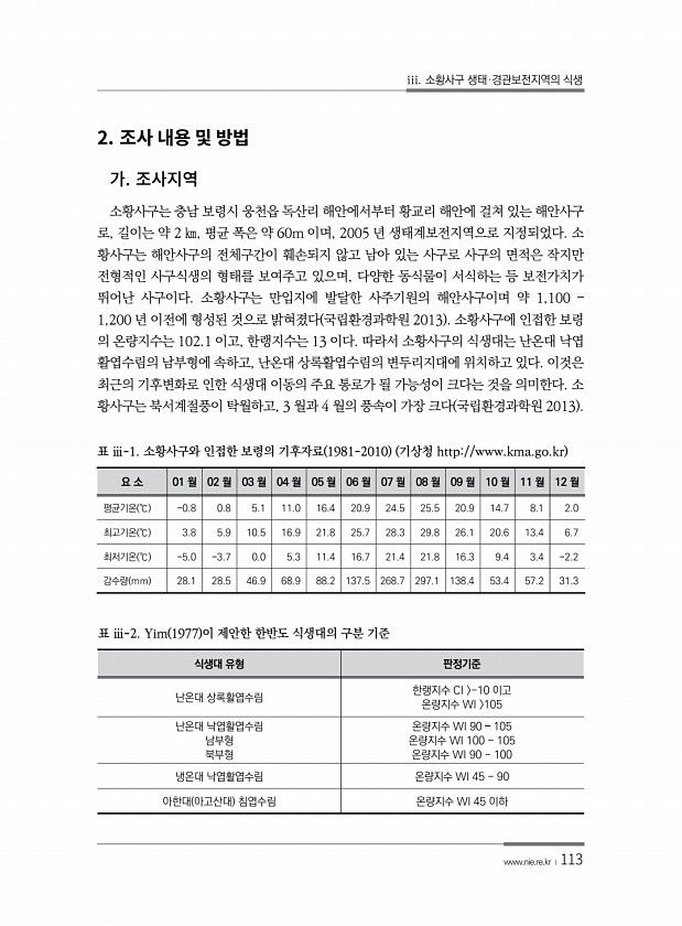 iii. 소황사구 생태·경관보전지역의 식생 www.nie.re.kr ?113 2. 소황사구는 충남 보령시 웅천읍 독산리 해안에서부터 황교리 해안에 걸쳐 있는 해안사구 로, 길이는 약 2 ㎞, 평균 폭은 약 60m 이며, 2005 년 생태계보전지역으로 지정되었다. 소 황사구는 해안사구의 전체구간이 훼손되지 않고 남아 있는 사구로 사구의 면적은 작지만 전형적인 사구식생의 형태를 보여주고 있으며, 다양한 동식물이 서식하는 등 보전가치가 뛰어난 사구이다. 소황사구는 만입지에 발달한 사주기원의 해안사구이며 약 1,100 ? 1,200 년 이전에 형성된 것으로 밝혀졌다 국립환경과학원 2013 소황사구에 인접한 보령 의 온량지수는 102.1 이고, 한랭지수는 13 이다. 따라서 소황사구의 식생대는 난온대 낙엽 활엽수림의...