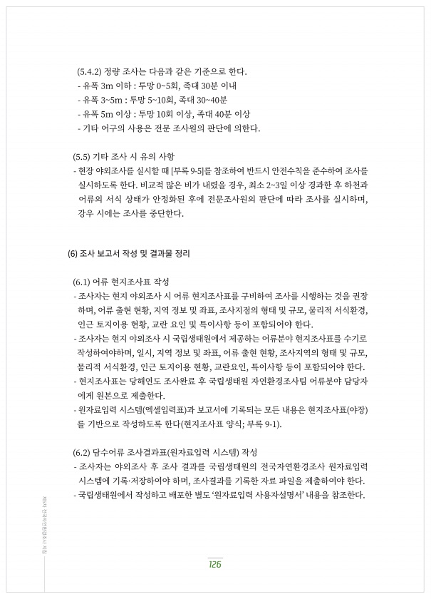 126 제5차 전국자연환경조사 지침 ?.?.? 정량?조사는?다음과?같은?기준으로?한다. 유폭 ?m 이하 투망 ??회, 족대 ??분?이내 유폭 ??m 투망 ???회, 족대 ????분 유폭 ?m 이상 투망 ??회?이상, 족대 ??분?이상 기타?어구의?사용은?전문?조사원의?판단에?의한다. ?.? 기타?조사?시?유의?사항 현장?야외조사를?실시할?때 [부록 ?-?]를?참조하여?반드시?안전수칙을?준수하여?조사를 실시하도록?한다. 비교적?많은?비가?내렸을?경우, 최소 ??일?이상?경과한?후?하천과 어류의?서식?상태가?안정화된?후에?전문조사원의?판단에?따라?조사를?실시하며, 강우?시에는?조사를?중단한다. 6 조사?보고서?작성?및?결과물?정리 ?.? 어류?현지조사표?작성 조사자는?현지?야외조사?시?어류?현지조사표를?구비하여...