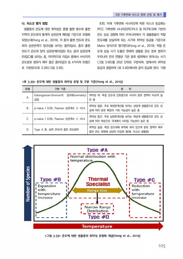 3장 기후변화 리스크 항목 선정 및 평가 105 나. 리스크 평가 방법 생물종의 온도에 대한 취약성은 종별 출현 횟수와 출현 지역의 온도와의 통계적 상관관계 패턴을 기준으로 유형화 되었는데 Hong et al., 2019 , 각 종의 출현 빈도와 온도 와의 상관관계가 정규성을 보이는 종 타입A , 종의 출현 빈도가 온도와 양의 상관관계 타입B 또는 음의 상관관계 타입C 를 보이는 종, 마지막으로 타입A 중에서 서식지의 온도분포 범위가 매우 좁은 종 타입D 등 4가지의 유형으 로 구분된다 표 3.39 그림 3.59 또한, 미래 기후변화 시나리오에 따른 리스크 등급화는 IPCC 기후변화 시나리오 RCP4.5 및 RCP8.5 에 기반의 온도 상승 경향에 따라 우리나라에서 각 생물종들이 적합 온도대를 상실하게 되는...