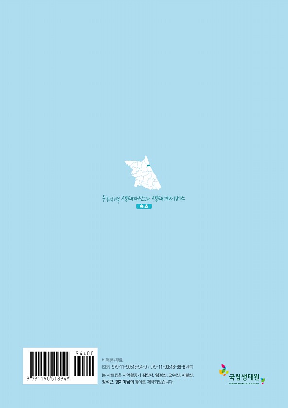 속 초 우리지역생태자산과 생태계서비스 비매품/무료 ISBN 979-11-90518-94-9 979-11-90518-88-8 세트 본 자료집은 지역활동가 김안나, 엄경선, 오수진, 이필선, 장석근, 함지미님의 참여로제작되었습니다.