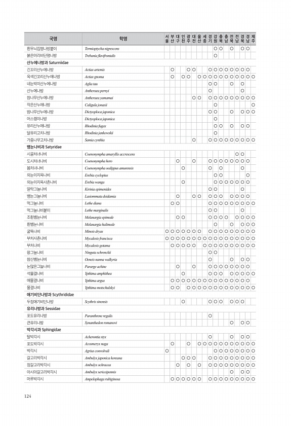 124 흰무늬집명나방붙이 Termioptycha nigrescens ○ ○ ○ ○ ○ 붉은머리비단명나방 Trebania favifrontalis ○ 산누에나방과 Saturniidae 긴꼬리산누에나방 Actias artemis ○ ○ ○ ○ ○ ○ ○ ○ ○ ○ ○ 옥색긴꼬리산누에나방 Actias gnoma ○ ○ ○ ○ ○ ○ ○ ○ ○ ○ ○ ○ ○ ○ 네눈박이산누에나방 Aglia tau ○ ○ ○ ○ 산누에나방 Antheraea pernyi ○ ○ 참나무산누에나방 Antheraea yamamai ○ ○ ○ ○ ○ ○ ○ ○ ○ ○ ○ 작은산누에나방 Caligula jonasii ○ ○ 밤나무산누에나방 Dictyoploca japonica ○ ○ ○ ○ ○ ○ 어스렝이나방 Dictyoploca japoni...