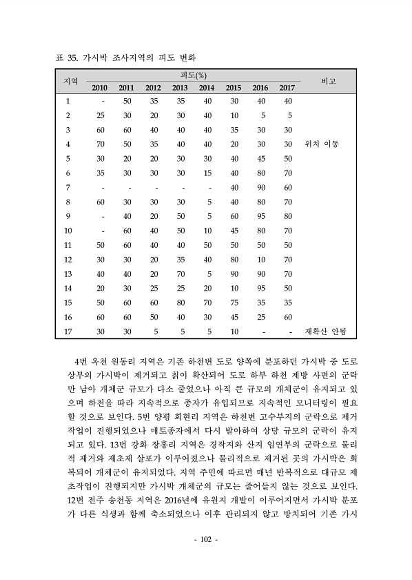 102 지역 피도 % 비고 2010 2011 2012 2013 2014 2015 2016 2017 1 50 35 35 40 30 40 40 2 25 30 20 30 40 10 5 5 3 60 60 40 40 40 35 30 30 4 70 50 35 40 40 20 30 30 위치 이동 5 30 20 20 30 30 40 45 50 6 35 30 30 30 15 40 80 70 7 40 90 60 8 60 30 30 30 5 40 80 70 9 40 20 50 5 60 95 80 10 60 40 50 10 45 80 70 11 50 60 40 40 50 50 50 50 12 30 30 20 35 40 80 10 70 13 40 40 20 70 5 90 90 70 14 20 30 25 25 20 10 95 50...