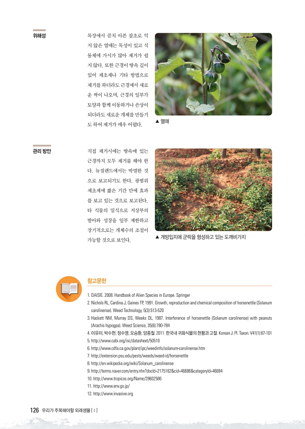 126 우리가 주목해야할 외래생물 [Ⅰ] 참고문헌 1. DAISIE. 2008. Handbook of Alien Species in Europe. Springer 2. Nichols RL, Cardina J, Gaines TP, 1991. Growth, reproduction and chemical composition of horsenettle Solanum carolinense Weed Technology, 5 3 513-520 3. Hackett NM, Murray DS, Weeks DL, 1987. Interference of horsenettle Solanum carolinense with peanuts Arachis hypogpa Weed Science, 35 6 780-784 4. 이유미, 박수...